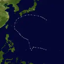 An area of disturbed weather organized into a tropical depression on September 18 about 250 miles (400 km) west of Guam. The depression slowly intensified as it moved generally northwestward, and by September 21 it attained typhoon status while located about east of Aparri on Luzon. Shortly after strengthening into a typhoon, the storm turned to the northeast and paralleled the southern coastline of Japan a short distance offshore. It was last observed on September 24.[7]