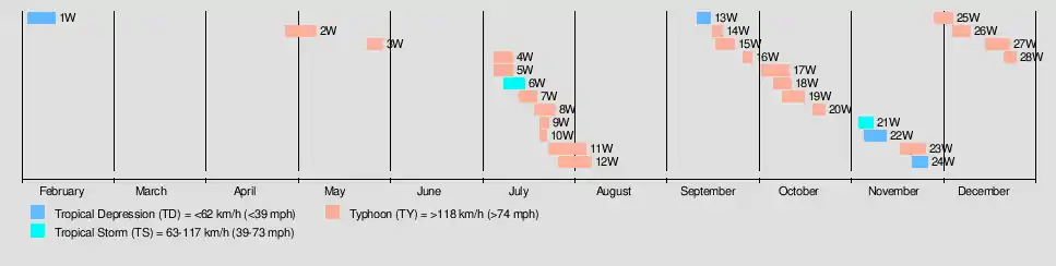 There were 29 known tropical cyclones, including 24 of typhoon status, of which several of the storms were deadly. A typhoon in November was the deadliest cyclone of the season, causing 49 deaths as it crossed the Philippines. The same typhoon later struck Hong Kong, where the Hong Kong Observatory recorded the first period of calm during the eye of a cyclone. At least 151 people were killed during the season, with 12 missing and unconfirmed of their status during some point during the season.