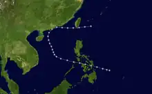 A well-developed typhoon was first observed on November 29 while located about 150 miles (240 km) south of Yap. It moved to the northwest, and struck Samar Island on December 2. The typhoon continued northwestward through the archipelago, and gradually weakened while drifting through the South China Sea. It turned to the northeast, and dissipated on December 5 off the coast of northern Luzon. The typhoon produced heavy rainfall and strong winds along its path through the Philippines. Rivers throughout Masbate island were overflown from the abundant rainfall, causing 34 fatalities on the island. A station on Samar Island recorded a barometric minimum of 975.0 hectopascals (28.79 inHg).[10]