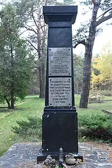 The site of mass executions in the forest in Pietrasze was marked and fenced after the war. The victims are commemorated by a concrete monument in the shape of a black obelisk, standing on a plinth covered with white marble slabs. Two boards were hung on it, with an inscription in Polish and Hebrew:[76]