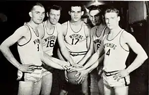 The 1942–43 Wyoming Cowboys basketball team represented the University of Wyoming in NCAA men's competition in the 1942–43 NCAA college basketball season.[1] The Cowboys won the Mountain States Conference championship and were the first basketball team from the Rocky Mountains to win an NCAA title. Kenny Sailors of Hillsdale, Wyoming averaged 15.5 points per game and Milo Komenich averaged 16.7 points per game in leading the team to the championship.[2] Despite playing just nine home games during the year, the Cowboys won 32 games.[3]