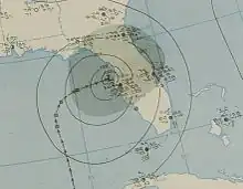 Damage from the hurricane throughout Florida was relatively minor. Citrus trees were stripped of their branches, roadways were washed out, and some telephone and power lines were toppled, temporarily severing communication.[5] Tampa recorded a record 24-hour rainfall total of 10.42 in (265 mm),[3] while precipitation peaked at 13.6 in (350 mm) in Lake Alfred.[6] Statewide, the heavy precipitation was regarded as beneficial in ending one of the worst recorded droughts there.[3] Two tornadoes were spawned; one blew a transformer off a platform and ripped a section of railing off a causeway, while both damaged some homes. Total damage reached $75,000 throughout Miami.[7] Farther north, telephone communications around Georgetown, South Carolina were disrupted, while winds gusted as high as 69 mph (111 km/h) and rainfall peaked at 5.58 in (142 mm) in Charleston.[8] In Wilmington, North Carolina, 8.24 in (209 mm) of rain was observed, causing considerable damage to the city's storm sewer system.[9] Although the core of the cyclone passed east of New England, at least 10,000 telephone lines were downed by the storm. Buildings, crops, and trees were damaged, while low visibility led to a traffic accident that killed a man in Warwick, Rhode Island.[10]