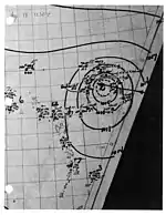 The final Atlantic hurricane of 1945 was not officially documented until over a decade following the end of the season. Using re-analyzed surface weather maps, as well as recounts from local residents along the storm's path, it was discovered that a tropical depression formed south of Jamaica in the southwestern Caribbean Sea by 12:00 UTC on October 10.[2][21] The compact storm moved north and then north-northeast ahead of a stationary front that existed from the western Atlantic into the Bay of Campeche. It became a minimal hurricane over the Cayman Islands by 00:00 UTC on October 12 and attained its peak at Category 2 intensity with winds of 100 mph (160 km/h) while making landfall along a deserted southern stretch of Cuba. The storm emerged into the Bahamas while maintaining Category 1 strength before becoming intertwined with the frontal zone and transitioning into an extratropical cyclone southwest of Bermuda.[21] The post-tropical storm slowly weakened but persisted until it was absorbed by a large extratropical low near the Azores on October 16.[2]
