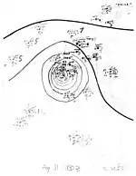 Another short-lived tropical storm was first identified about 195 mi (314 km) east of Guadeloupe by 12:00 UTC on September 9. Data from a reconnaissance aircraft indicated the storm intensified slightly to attain winds of 60 mph (97 km/h) by early the next day,[2] in spite of a poorly-defined circulation center.[3] It tracked northwest and then north, passing within 130 mi (210 km) of Bermuda before dissipating around 18:00 UTC on September 12.[2]