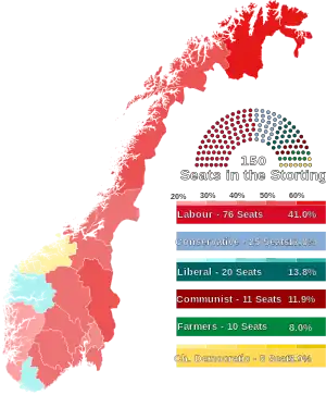 Parliamentary elections were held in Norway on 8 October 1945,[1] the first following World War II and the end of the German occupation. The result was a victory for the Labour Party, which won 76 of the 150 seats in the Storting, the first time a party had won a majority since the 1915 elections.