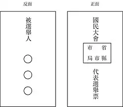 Ballot for election, with "Delegates of National Assembly election ballot" at the front and "Nominees" at the back[5]
