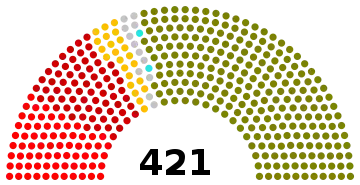 Composition of the National Assembly in June 1947. By the dissolution of Parliament, the Smallholders' original absolute majority of 245 seats had been reduced to a plurality of 187 due to mass Communist arrests of its members and expulsions from the coalition.[2]