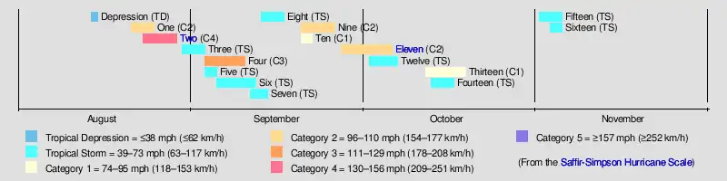 The 1949 Atlantic hurricane season was the last season that tropical cyclones were not publicly labeled by the United States Weather Bureau.[1] It officially began on June 15, and lasted until November 15. These dates conventionally delimit the period of each year when most tropical cyclones form in the Atlantic basin. The first storm, a tropical depression, developed in the northern Gulf of Mexico on August 14. The final system, Tropical Storm Sixteen, dissipated in the southwestern Caribbean Sea on November 5. It was a fairly active season, featuring 16 tropical storms and seven hurricanes. Two of these strengthened into major hurricanes, which are Category 3 or higher on the Saffir–Simpson hurricane wind scale.[2]