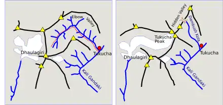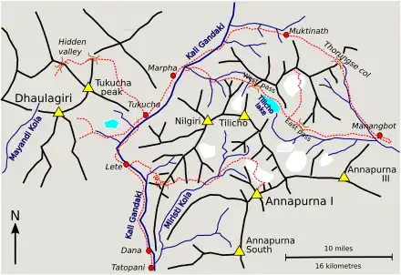 Dhaulagiri and Annapurna are 34 kilometres (21 miles) apart on either side of the gorge of the Kali Gandaki river, a tributary of the Ganges.[11][26] As the expedition approached from the south Dhaulagiri was clearly visible as a white pyramid to the west whereas Annapurna to the east was hidden behind the Nilgiri mountains. On first seeing Dhaulagiri on 17 April the immediate impression was that it was unclimbable. They could not see Annapurna but there was a break in the Nilgiris where the Miristi Kola flows into the Kali Gandaki through a deep and narrow gorge with an impenetrable entrance. The 1920s Survey of India map they were using (see left-hand Annapurna map below) showed a path leading up the gorge and over "Tilicho Pass" that might provide a route to the north face of Annapurna. However, none of the local inhabitants they spoke to knew of a path or had any further information. Continuing up the Kali Gandaki Gorge the team reached the market town of Tukusha at 2,600 metres (8,500 ft) on 21 April. The people lived there in primitive conditions – Terray described the place as having "biblical charm".[note 10] Couzy climbed a 4,000-metre (13,000 ft) Nilgiri peak to the east of Tukusha to inspect the eastern Dhaulagiri terrain and he concluded the southeast ridge was "absolutely frightful". Even so, Herzog decided that they should first focus on Dhaulagiri, the higher mountain, since they would only have to investigate possible routes to the summit and would not have to reconnoitre to find the mountain itself.[28]