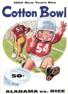 The 1954 Cotton Bowl Classic, part of the 1953 bowl game season, took place on January 1, 1954, at the Cotton Bowl in Dallas, Texas. The competing teams were the Alabama Crimson Tide, representing the Southeastern Conference (SEC) as conference champions, and the Rice Owls, representing the Southwest Conference (SWC) as conference co-champions. Rice won the game 28–6, but its victory was overshadowed by Alabama's Tommy Lewis and his "12th man tackle" of Rice running back Dicky Maegle in the second quarter.
