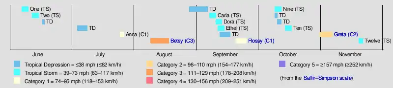 The season officially started on June 15, although an unnamed storm developed about a week prior over the western North Atlantic Ocean. A later storm that formed over the Gulf of Mexico on June 12 alleviated drought conditions in the south-central United States. Hurricane Anna developed in late July and hit Mexico. Tropical storms Carla and Ethel both formed near the Bahamas and moved northeastward until dissipating. The only hurricane that hit the contiguous United States was Hurricane Flossy. One of the final storms of the year, Greta, was an unusually large hurricane that produced high waves from Florida to the Lesser Antilles. It developed in the western Caribbean and moved across much of the southeastern United States, causing $24.8 million in damage and 15 deaths. There were also several tropical depressions, as well as one subtropical cyclone, in the season.