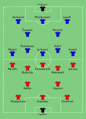 The final was played on 10 July 1960 at the Parc des Princes in front of a crowd of 17,966.[22] Yugoslavia dominated the early stages of the match and Soviet Union goalkeeper Lev Yashin was forced to save two free kicks from Kostić. Šekularac's shot then passed just wide with Yashin static. Two minutes before half-time, Yugoslavia took the lead. Jerković played in a low cross which was deflected into the goal past Yashin. Analysis of video of the match is inconclusive: the goal was either scored by Galić or diverted into his own net by the Soviet Union's Igor Netto who was marking the Yugoslavian player. However, historically Galić is credited with the goal.[23] During the interval, former Soviet Union player Boris Kuznetsov who was with the squad, added spikes to his side's boots to cope with the wet conditions underfoot. Four minutes after half-time, the Soviet Union equalised: Valentin Bubukin struck a left-footed shot from around 25 yards (23 m) which was mishandled by Vidinić and Metreveli scored from close range. Late in the match, Metreveli's cross-shot passed across the goalmouth and was missed by Ponedelnik before Ivanov struck it wide from close range. Regular time ended 1–1 and the match went into extra time.[24]