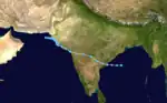 Deep Depression Seven existed from September 8 to September 15.[9] The storm moved from east to west throughout its lifetime. It formed on September 8 in the western Bay of Bengal and made landfall on eastern India on September 8. The depression crossed India and traced the western coast of the country from September 10 to September 14, making two sharp turns along the way. The storm dissipated in the extreme northern Arabian Sea on Septemebr 15.