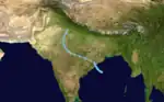 Severe Cyclonic Storm Twelve developed on November 26. It was the strongest tropical cyclone of the season, peaking with winds of 140 km/h (85 mph). The system dissipated on November 29.[17] The storm moved from east to west and made a Tropical Storm-equivalent landfall on eastern India.