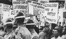 The period witnessed an intense "popular mobilization".[32] Unionists and members of the Leagues joined other members of the left. They were heterogeneous, but they had in common the demand for base reforms — "banking, fiscal, administrative, urban, agrarian and university" — "in addition to extending the right to vote to illiterates and non-graduated officers of the Armed Forces", the legalization of the PCB, the Independent Foreign Policy, the "control of foreign capital and the state monopoly of strategic sectors of the economy".[33] The left was suspicious of Goulart, and both sought to ally themselves for reforms, but still seeing themselves as autonomous.[34] The president came under heavy criticism from the left, who rejected his conciliation efforts.[18]