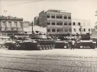 The Army had a marginal participation in the containment of the insubordinates. The disciplinary situation in the Land Force was better, and its soldiers did not join the revolt.[74] The support was requested by the Navy Minister to the Ministry of War and included twelve tanks and 500 soldiers[72] of the Mechanized Reconnaissance Regiment and the 1st Army Police Battalion,[lower-alpha 4] the latter with the field presence of Colonel Domingos Ventura.[68] Participation was requested for both offensives, and by the afternoon the entire block was closed by the Army.[73] However, the official position of the War Ministry was that the problem "at present, is restricted to the purview of the Navy Ministry."[68]