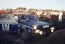 Hopkirk, the first driver on the scene (ahead of Cowan on the road, but behind on penalties) stopped to tend to the injured and extinguish the flames in the burning cars. Andrew Cowan, next on the scene, also slowed but was waved through with the message that everything was under control. Hopkirk rejoined the rally, and neither he nor Cowan lost penalties in this stage.[11] So Andrew Cowan, who had requested "a car to come last" from the Chrysler factory on the assumption that only half a dozen drivers would even reach Sydney,[12] took victory in his Hillman Hunter and claimed the £10,000 prize. Hopkirk finished second, while Australian Ian Vaughan was third in a factory-entered Ford XT Falcon GT. Ford Australia won the Teams' Prize with their three Falcons GTs,[13] placing 3rd, 6th and 8th.[14]