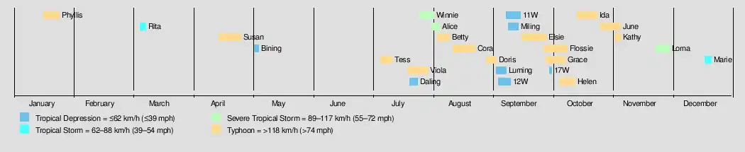 On September 19, Tropical Depression 14W formed over the open Western Pacific. It tracked almost due westward, becoming a tropical storm on the 20th and a typhoon on the 21st. Elsie continued to intensify, and reached a peak of 175 mph winds on the 24th. After peaking, the typhoon steadily weakened as it moved westward. On the 26th 105 mph Typhoon Elsie hit northern Taiwan, and a day later hit eastern China. After drifting northward, Elsie dissipated over China on September 28. The typhoon killed 102 people, with 24 missing and 227 injured from the system.