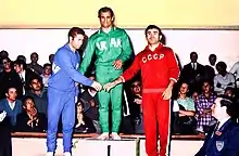 Medal winners of Greco-Roman 48 kg. From left to right, Rahim Aliabadi, Gheorghe Berceanu and Vladislav Kustov