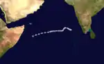 The remnant low of a depression emerged into the Arabian Sea off Kerala late on November 21, and developed into a new depression on the next day, as it moved westward. The depression moved further west, and gradually turned toward the southwest, intensifying as it did so. It became a cyclonic storm on November 28, to the southeast of Socotra, and reached its peak intensity with winds of 75 km/h (45 mph) soon after. The cyclone continued to move west-southwestward, and rapidly weakened into a remnant low-pressure area off the Somalia coast on the next day, ending the season.[2] The cyclone brought widespread rain to the Laccadives from November 22 to 24, with 60 mm (2.4 in) recorded on Amini on November 23.[2]