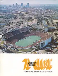 The 1972 Cotton Bowl Classic was a college football bowl game between the Penn State Nittany Lions and the Texas Longhorns. The 36th Cotton Bowl Classic, it was played on Saturday, January 1, 1972, at the Cotton Bowl in Dallas, Texas.[1][2]