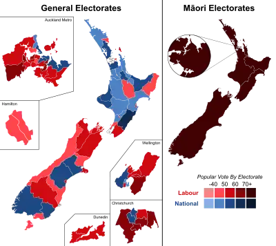 In the South Island, three electorates were abolished (Buller, Westland, and Selwyn), and three electorates were newly created (Rakaia, Tasman, and West Coast).[7] In the North Island, five electorates were abolished (Hauraki, Marsden, Otaki, Waimarino, and Waitomo), two electorates were recreated (Coromandel and Otahuhu), and six electorates were newly created (East Coast Bays, Hamilton East, Kapiti, King Country, Ruahine, and Whangarei).[8]