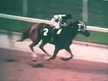 Out of the starting gate, Secretariat and Sham raced evenly through the first turn.[7][16] Through a half-mile, the two were even.[16] Entering the backstretch and approaching three-quarters of a mile, Secretariat began to distance himself as Sham began to fade, ultimately finishing last.[17] It was later discovered that Sham had suffered a hairline fracture of his right front cannon bone during the race, which ended his racing career.[18]