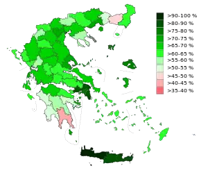 The electorate voted categorically in favour of republic. Crete gave more than 90% of its vote for the republic, but in around thirty constituencies, the result for republic was around 60–70%. The largest wins for the restoration of the monarchy were in the Peloponnese and Thrace, at around 45%. The constituencies with the highest votes for the restoration were Laconia at 59.52%, Rhodope at 50.54%, Messenia with 49.24%, Elis at 46.88% and Argos at 46.67%.