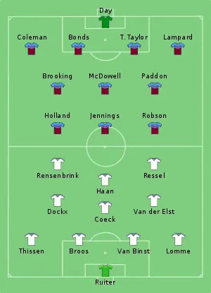 Pat Holland put West Ham into the lead in the 28th minute. Just before half-time, Frank Lampard misjudged a back pass, allowing Peter Ressel to collect the ball and pass it to Rob Rensenbrink to score the equaliser. In attempting the backpass, Lampard tore a stomach muscle that ruled him out of much of the remainder of the game. Three minutes into the second-half, François van der Elst scored, assisted by Rensenbrink. Keith Robson later equalised for West Ham from a cross by Trevor Brooking. Anderlecht were awarded a clear penalty in the 73rd minute, after Holland rashly challenged and fouled Rensenbrink who then scored from the penalty. Holland obviously misjudged the tackle and was duly penalised. With two minutes left, as West Ham fell apart, van der Elst ran through to score Anderlecht's fourth goal for a deserved victory.