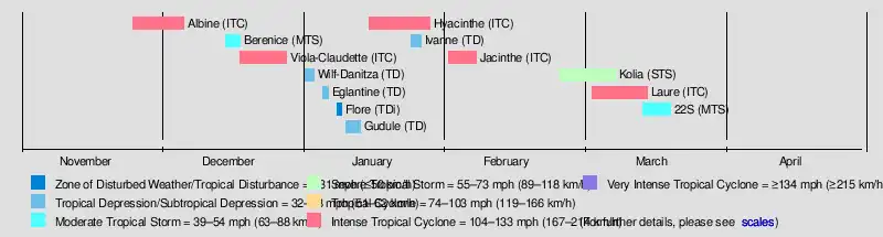 Laure existed from 8 March to 17 March. On March 13, the cyclone passed just east of Mauritius, producing wind gusts of 109 km/h (68 mph) and 65.7 mm (2.59 in) of rainfall.[12]