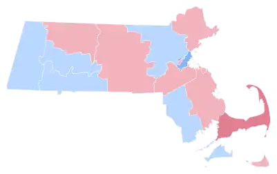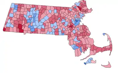 While Reagan nationally won a convincing victory in the electoral college, Massachusetts would be his narrowest win, with the state being about ten percent more Democratic than the national average.[4] As of 2023, this election marks only the third and last time (after 1852 and 1972) that Massachusetts has not voted for the same candidate as neighboring Rhode Island. It is also the last time that the towns of Belmont, Heath, Hull, Lexington, Lincoln, Swampscott, Truro, Warwick, and Wellfleet have voted Republican.