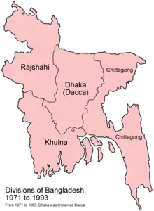 In 1980, Bangladesh was administratively divided into 4 divisions, namely Dhaka, Chittagong, Khulna and Rajshahi which were further subdivided into a total of 18 districts (See List of districts of Bangladesh). On 23 December 1982 the Local Government (Thana Parishad and Thana Administration Reorganisation) Ordinance was promulgated to introduce major changes with respect to the system of local government at the thana level. Under the reorganised set-up, thana was designated as the focal point of administration. In 1983, the Local Government Ordinance of 1982 was amended to re-designate and upgrade the existing thanas as upazilas (sub-districts).[4] Furthermore, during 1983–84, 46 new districts were created by upgrading them from thanas or upazilas. By the end of the decade the number of districts stood at 64.