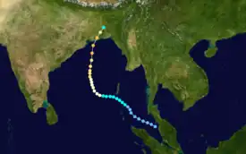 Map plotting the storm's track and intensity, according to the Saffir–Simpson scale