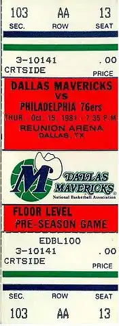 A ticket for an October 1981 pre-season game between the Dallas Mavericks and the season's eventual Eastern Conference champions Philadelphia 76ers.
