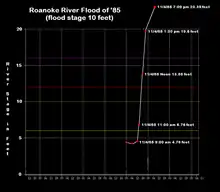 The city of Roanoke recorded 6.61 in (168 mm) in a 24‑hour period, the highest 24‑hour total on record for the city since records began in 1912; of the total, 4.25 in (108 mm) fell in about three hours. After previously wet conditions, the Roanoke River at Roanoke rapidly rose 18.57 ft (5.66 m) in ten hours to its peak of 23.35 ft (7.12 m), well above the flood stage of 10 ft (3.0 m). The floods were considered a 1 in 200 year event,[6] and in one instance near Salem, the waters rose to the height of a three-story building.[5] Many surrounding rivers, including the James River, also rose,[6] with 63 peak discharge rates in local streams.[10] The high rivers flooded much of downtown Roanoke, including roads, rail lines, houses, and businesses,[6] with some roads and bridges closed for weeks.[11] Residents survived by holding onto trees, while others, some trapped in their cars, required rescue; one helicopter rescued 125 stranded people. There were 10 deaths in and around Roanoke, including three who drove into flooded rivers, and three others who refused to evacuate.[6] The floods damaged about 3,000 homes and 100 businesses.[12] Overall monetary damage in the city was estimated at $225 million,[6] with $520 million in the entire metropolitan area,[12] making it the city's worst flood on record.[13]