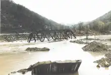 Much of the eastern portion of West Virginia was declared a federal disaster area on November 7, 1985.[1][8] Within two weeks of the declaration, the United States Army Corps of Engineers (USACE) began clearing debris across the state, which was completed by July 1986.[8] Widespread areas were under a boil-water advisory due to damage to water facilities, prompting officials to deliver trucks with bottled water through disaster areas.[14] The state's highway department worked with FEMA and the USACE to clear destroyed buildings. Workers also buried killed animals, cleared blocked streams, and helped farmers regrow lost crops.[17] FEMA opened 20 disaster centers across the state to coordinate residents' requests for federal aid, and used 290 full or part-time employees. Overall federal assistance totaled $285 million, including $171 million for debris removal and repairing infrastructure, $90 million for loans and temporary housing, and $24 million through payments from the National Flood Insurance Program. This followed a six-week period when applications for such assistance were processed. After receiving complaints about inadequate funding, FEMA increased payments to 869 people. FEMA also built 647 temporary mobile homes, only about half of which were utilized.[8] Residents complained that the money spent on the homes was misdirected and instead should have been given directly to victims. Many residents in Albright moved away after the main industry - river rafting - was washed away.[31] In the city of Parsons, most businesses relied on small business loans to continue operating, although 18 stores never reopened following the floods.[32] Officials held a telethon on state television and radio on December 7, 1985, that ultimately raised $1.7 million for storm victims in the state.[33] In the years after the flood, residents rebuilt houses farther away from flood plains, while officials rebuilt roads, bridges, and public buildings.[21]