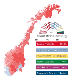 Parliamentary elections were held in Norway on 8 and 9 September 1985.[1] The Labour Party remained the largest party in the Storting, winning 71 of the 157 seats. It was the first election since 1885 in which the Liberal Party failed to win a seat.
