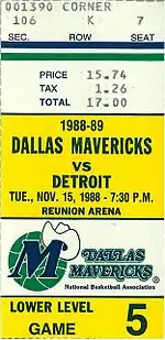 A ticket for a November 1988 game between the Dallas Mavericks and the season's eventual champions Detroit Pistons.