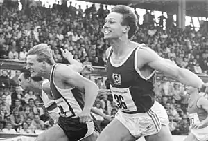 Sprinter Sven Matthes (right) winning the men's 100 metres