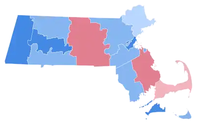As of 2020, this was the last time that the cities of Amesbury, Attleboro, Beverly, Braintree, Brockton, Franklin, Leominster, Marlborough, and Methuen and the towns of Abington, Alford, Auburn, Avon, Ayer, Barnstable, Massachusetts, Bedford, Bernardston, Bolton, Boxborough, Buckland, Burlington, Canton, Carlisle, Charlemont, Chelmsford, Clinton, Cummington, Danvers, Dedham, Dennis, Erving, Essex, Florida, Gosnold, Grafton, Groton, Hancock, Harvard, Harwich, Hawley, Holbrook, Holliston, Hopedale, Hudson, Ipswich, Littleton, Longmeadow, Manchester-by-the-Sea, Mansfield, Marblehead, Marion, Mattapoisett, Medway, Milton, Mount Washington, Needham, New Ashford, New Salem, Newbury, Northborough, Norton, Peru, Petersham, Plymouth, Reading, Rockland, Savoy, Sheffield, Shelburne, Shirley, Shrewsbury, Southborough, Southampton, Stow, Sudbury, Wakefield, Wellesley, West Newbury, Westborough, Westford, Westhampton, Weston, Winchester, Windsor, and Yarmouth voted Republican.