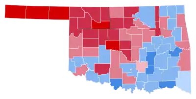 The election was very partisan, with more than 99 percent of the electorate voting for either the Democratic or Republican parties, and only four candidates appearing on the ballot.[1] The Southeastern portion of the state resumed turning out in large numbers for the Democratic Party; in 1984 almost all its counties voted in majority for Reagan. This may be somewhat attributed to the influence of the ongoing drought and the farming crisis in the Great Plains, and of the politically volatile state of Texas, which was also changing its political orientation through the 1980s and 1990s from a Democratic area to a largely Republican one. Bush's dominance in the more populated metro Oklahoma City and Tulsa ensured a safe GOP victory. However, despite Bush and Quayle winning the state, Oklahoma swung more to the Democrats from 1984 to 1988 than any other state in the nation, swinging by 21.30 percentage points. Additionally, this remains the last time that a Democrat has won more than sixty percent of the vote in any Oklahoma county (these being Jefferson, Haskell, Hughes, Coal and Choctaw).