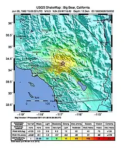 The 1992 Big Bear earthquake occurred at 08:05:33 PDT on June 28 in Big Bear Lake, California, with a moment magnitude of 6.5 and a maximum perceived intensity of VIII (Severe) on the Mercalli intensity scale. The earthquake occurred at a relatively shallow depth of 5 kilometers (3.1 mi).