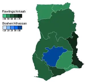 Jerry Rawlings, who had led the country since taking power in a 1981 coup, had grudgingly agreed to hold multiparty elections earlier in the year.[1] Rawlings ran as the candidate of the Progressive Alliance, which included his National Democratic Congress, and won 58.4% of the vote, enough to win without the need for a runoff. Voter turnout was 50.2%.[2]