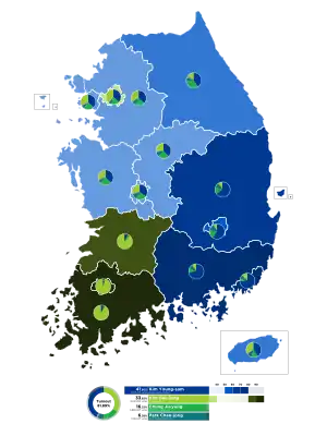 | South Chungcheong | 351,789 | 36.94 | 271,921 | 28.55 | 240,400 | 25.24 | 64,117 | 6.73 | 10,185 | 1.07 | 9,899 | 1.04 | 4,143 | 0.43 |