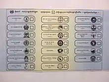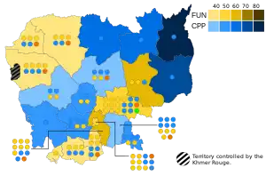 General elections were held in Cambodia between 23 and 28 May 1993. The result was a hung parliament with the FUNCINPEC Party being the largest party with 58 seats. Voter turnout was 89.56%.[1] The elections were conducted by the United Nations Transitional Authority in Cambodia (UNTAC), which also maintained peacekeeping troops in Cambodia throughout the election and the period after it.[2]