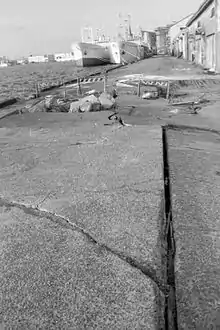 A peak ground acceleration of up to 922 cm/s² was recorded at Kushiro that lasted 30 seconds which caused extensive soil liquefaction and damage to the city.[13] In the city, six homes collapsed while 590 were affected, 33 of them sustaining serious damage. Further destruction of properties resulted from landslides and slope failures, some posing additional threats even after the earthquake. During one of the many landslides, a house slid ten meters down the slopes of a hill. The port area was also destroyed by liquefaction, buried manholes and sewage pipes were uplifted and erupted from the ground by up to 1.5 meters.[14] Uplift was observed along a 200 meter zone.[15] Two people were killed; one died from a falling ceiling light, the other was poisoned by gas. Sixty-one individuals were badly injured while another 661 had received minor injuries.[16]