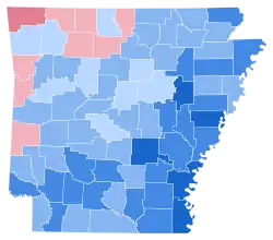 This is also the last election in which Washington County, Columbia County, Arkansas County, Faulkner County, Union County, Garland County, Johnson County, Howard County, Calhoun County, Saline County, Perry County, Miller County, Van Buren County, Montgomery County, Madison County, Pike County, Logan County, White County, Lonoke County, Pope County, Independence County, Cleburne County, Yell County, Conway County, Franklin County, Grant County, Sharp County, Sevier County, Marion County, Stone County, Fulton County, Scott County, Prairie County, and Cleveland County voted for a Democratic presidential candidate.[2]