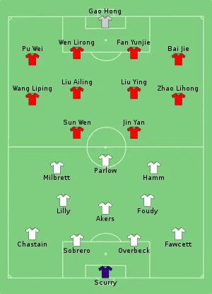 China reached the knockout stage by winning Group D. They shut out Russia in the quarterfinals, then easily defeated defending champion Norway 5–0 to reach the final.[10]