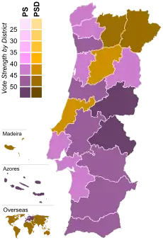Most voted political force by district. (Madeira and Azores not shown)