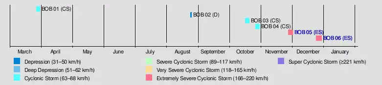 The season was much less active than the devastating 1999 season. Despite near normal water temperatures over the Arabian Sea, no storms developed in that portion of the basin. Convection was also lower than normal across the Bay of Bengal. The main factor against tropical cyclogenesis was persistently unfavorable wind shear. Overall, there were six depressions, five of which intensified into a cyclonic storm, which has maximum sustained winds of at least 65 km/h (40 mph).[4]